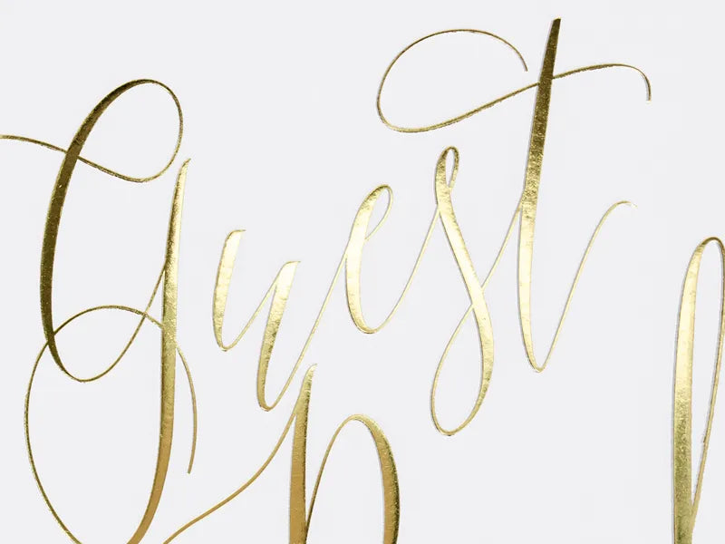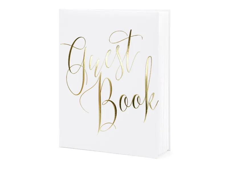 - Kovakantinen, valkoinen pohja ja kultaisella kirjoitettu teksti "Guest Book"