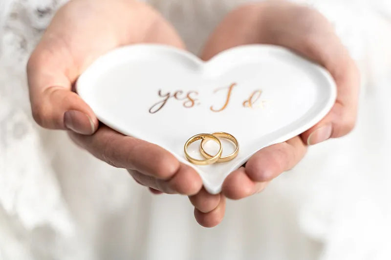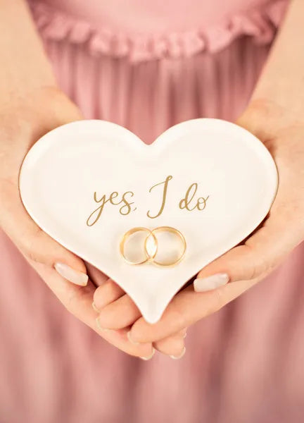 Kaunis sydämen muotoinen vihkisormusastia, jossa kultaisella teksti "yes, I do" 🤍