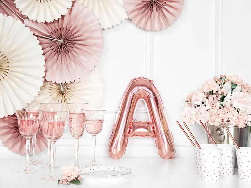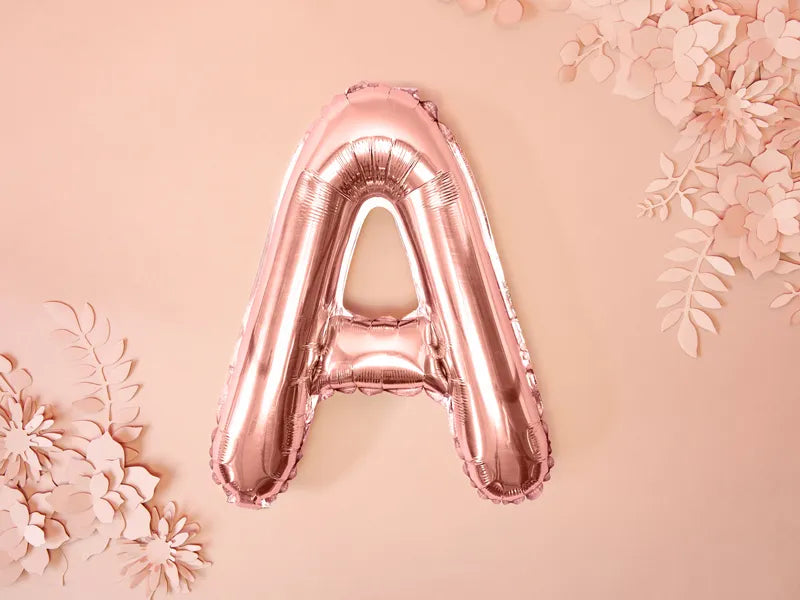 Ruusukullan värinen ilmalla täytettävä kirjainfoliopallo A juhlien somisteeksi! Yhdistele eri kirjaimia muodostaaksesi haluamasi tekstin.