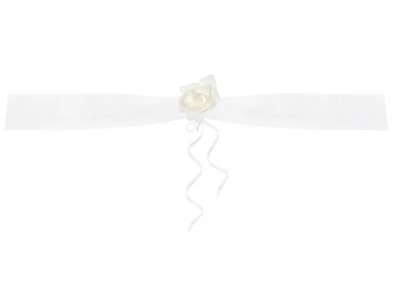 - Köynnöksen materiaali on kauniisti hohtavaa valkoista organzaa, ja siinä on n. 45 cm välein norsunluun värisiä satiiniruusuja.