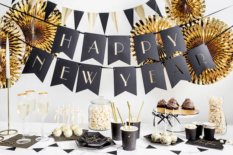 - Contains 14 pennants. Black pennants are black on both sides and metallic gold pennants are white on the reverse.