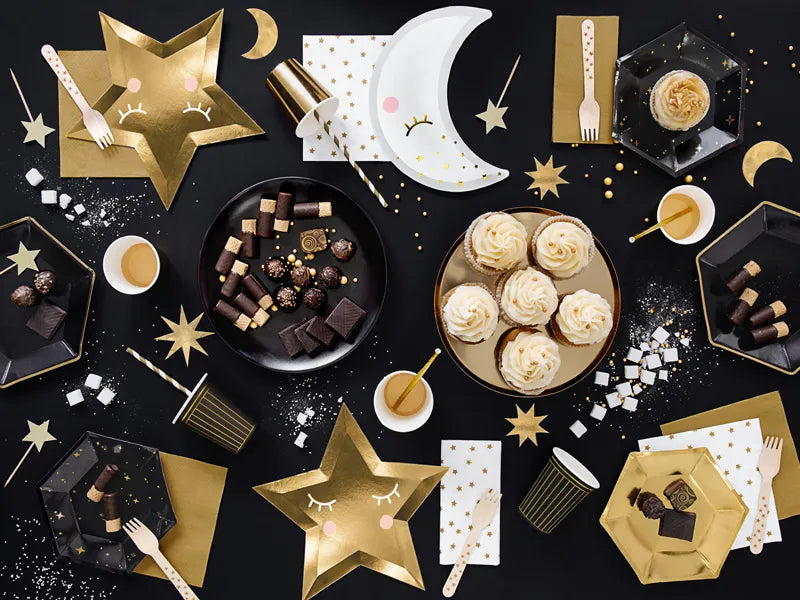 Stylish black plates with little metallic gold stars. The underside of the plates is white.