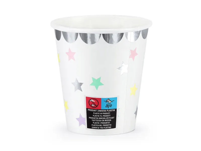 Lovely star patterned pastel cardboard mugs for Unicorn birthdays and other parties! Silver decoration on the top edge of the mug.