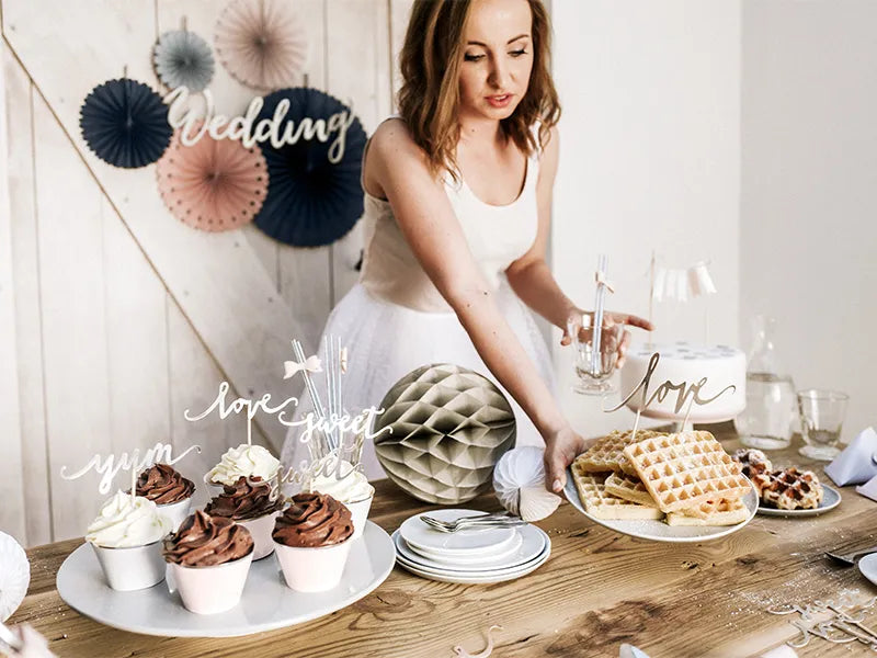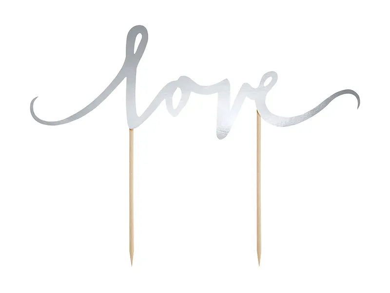 Kaunis metallinhohtohopeinen kakkukoriste tekstillä "love". Tekstin materiaali on kartonkia, jonka tausta on valkoinen.